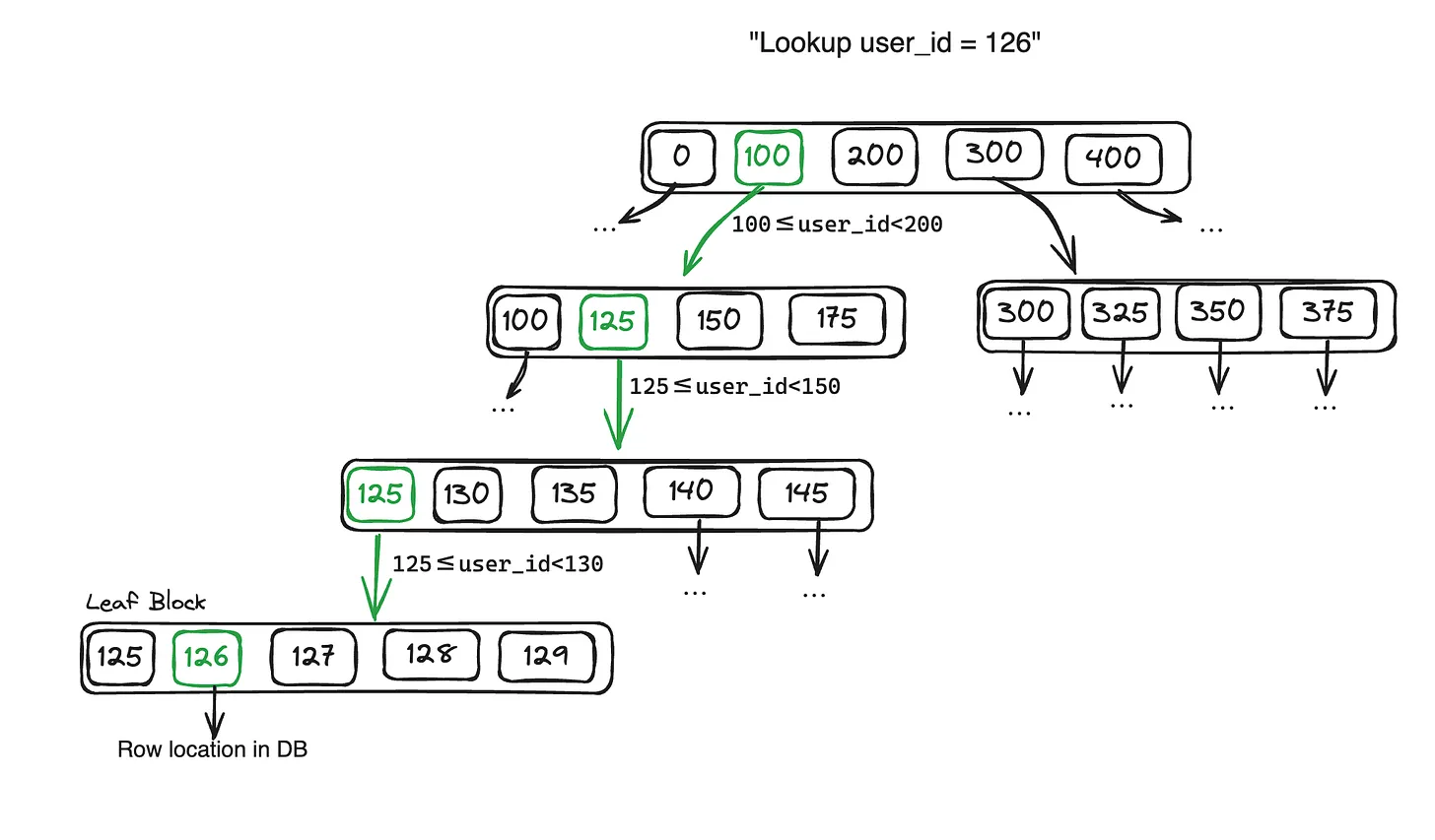 Let’s look at the image example. In this case, each index corresponds to a unique user id. Our indexes are sorted by key (1,2,3,4…100…200…) and the indexes are organised in ranges. The topmost block of range indexes includes a range from the min to the max value in our database. Each key points to a smaller range of values until we reach a leaf block. A leaf block are indexes that cannot be broken into smaller ranges. The indexes in a leaf block will give us the location of or row in the database.