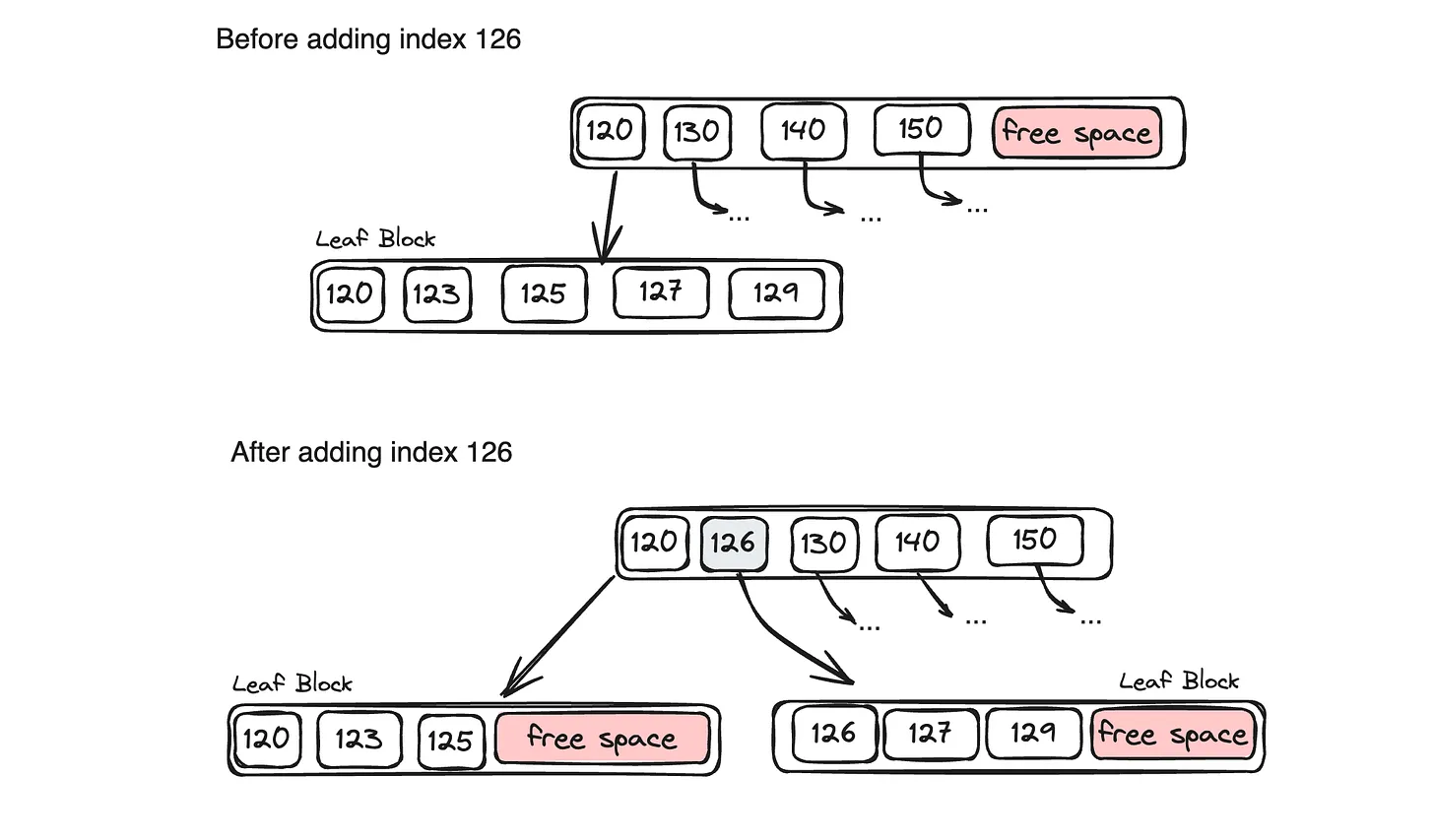 In BTrees, each block containing a range is of limited size. When adding a new key, it finds the leaf block and adds it. If there is not enough space in the block, it is broken into 2 and the new key is added.